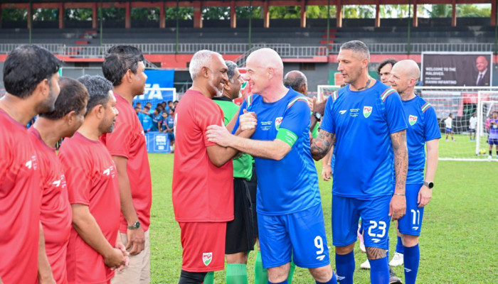 ފުޓްބޯލް އެސޯސިއޭޝަން އޮފް މޯލްޑިވްސް (އެފް.އޭ.އެމް) ކިޑްސް ފުޓްބޯލް ފެސްޓިވަލްގައި ބޭއްވި ޚާއްޞަ އެގްޒިބިޝަން މެޗެއްގައި ރައީސުލްޖުމްހޫރިއްޔާ ޑޮކްޓަރ މުޙައްމަދު މުޢިއްޒު އާއި، އިންޓަރނޭޝަނަލް ފެޑެރޭޝަން އޮފް އެސޯސިއޭޝަން ފުޓްބޯލް (ފީފާ) ގެ ރައީސް ޖިއަނީ އިންފަންޓީނޯ ބައިވެރިވެވަޑައިގެންފިއެވެ. މިއީ ފީފާގެ ރައީސް އިންފަންޓީނޯ ދިވެހިރާއްޖެއަށް ކުރައްވަމުންގެންދަވާ ޒިޔާރަތާ ގުޅިގެން އިންތިޒާމުކުރި ފުޓުބޯޅަ މެޗެކެވެ.