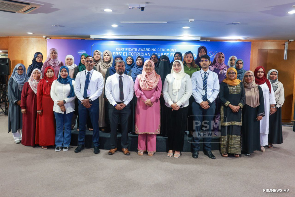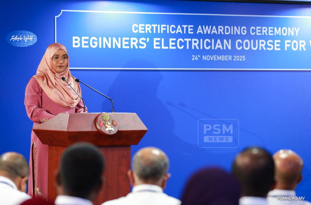 Speaking at the certificate awarding ceremony for the Beginners Electrician Course for Women, the First Lady highlighted the unconventional nature of the trade for Maldivian women, yet underscored its critical importance for household safety and economic empowerment.