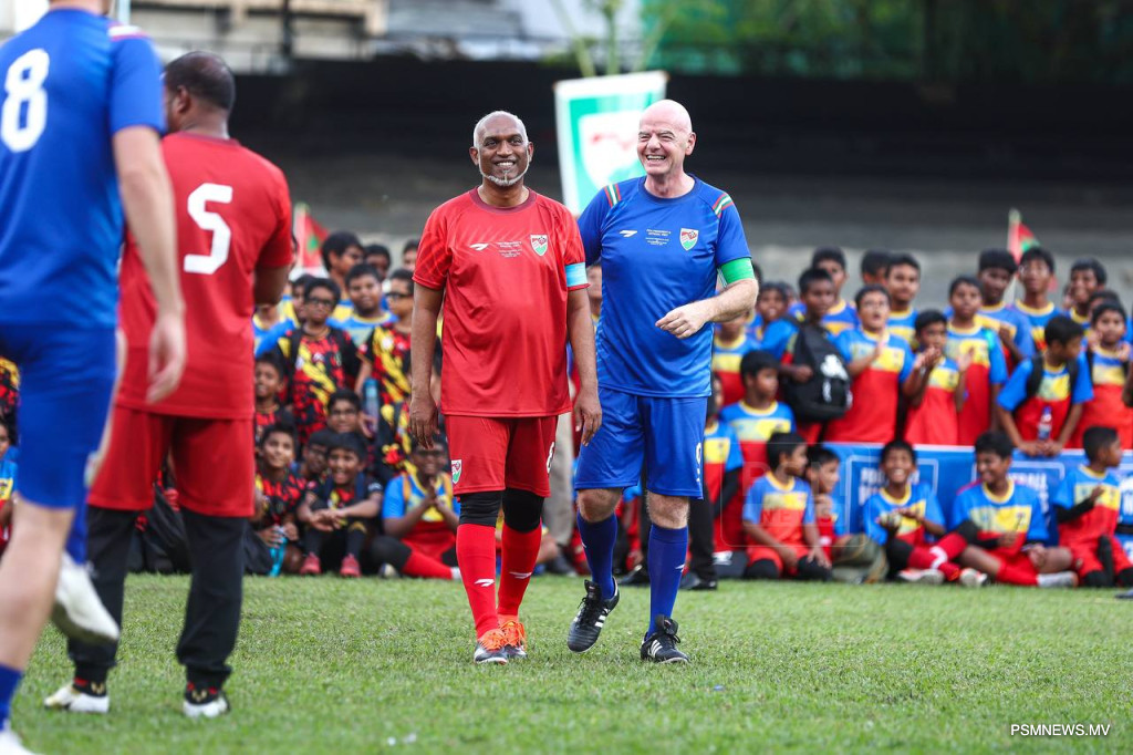 President Dr Muizzu and the Vice President graced the pitch alongside Italian FIFA World Cup winner Marco Materazzi and revered Maldivian football legends. FIFA President Infantino also joined the fray, leading his team to a spirited 6-4 victory, much to the delight of the spectators.
