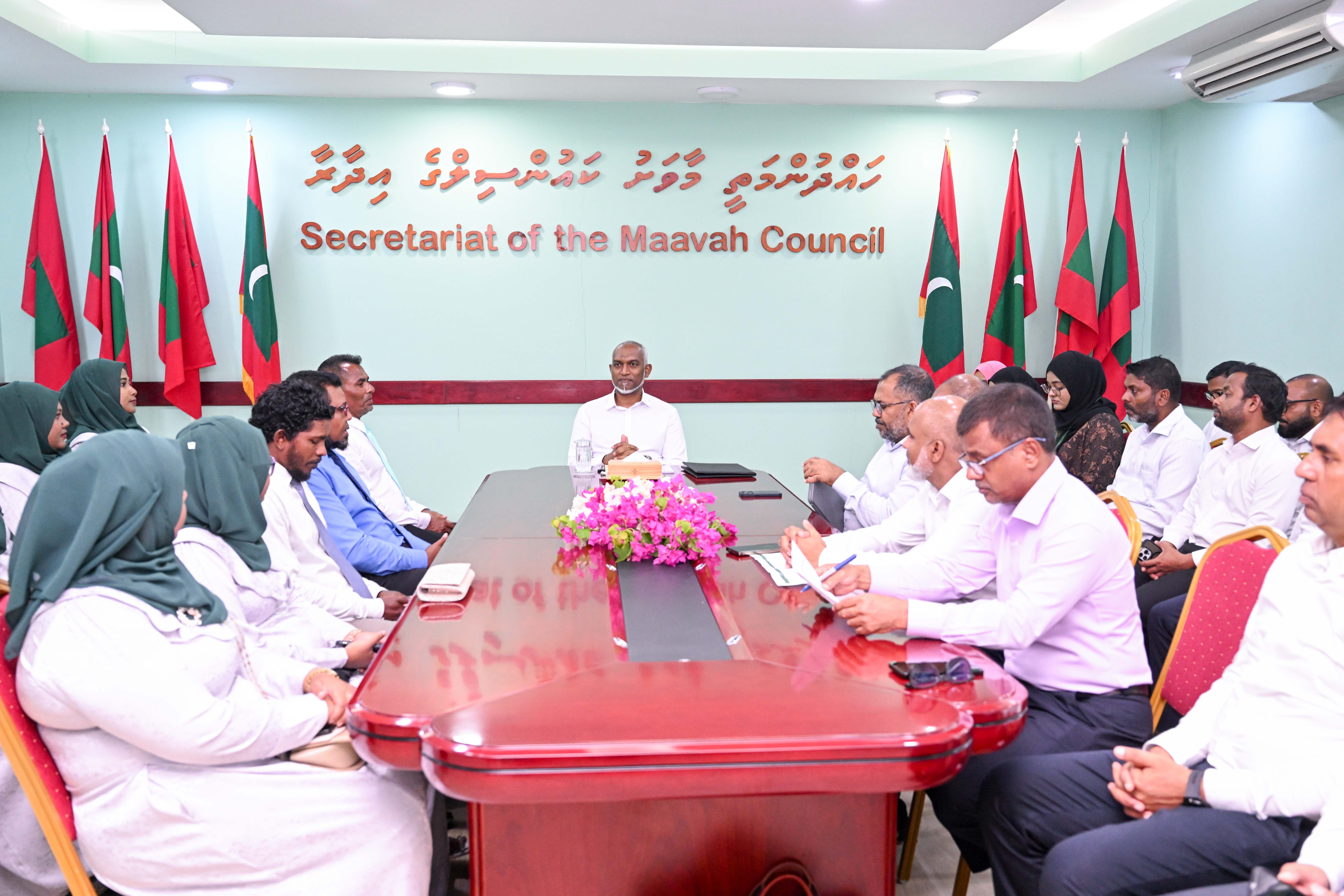 President Dr Mohamed Muizzu met with members of the L. Maavah Island Council, the Women’s Development Committee (WDC), and heads of local institutions to discuss the island’s key development priorities. The meeting was held at the Secretariat of the Maavah Council.