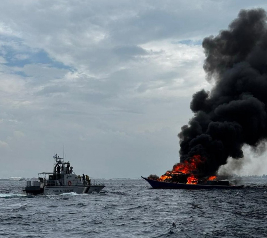 The boat Fresh from the Sea, carrying 15 people, caught fire at 14:55 on Saturday while travelling near Male'. The vessel later sank, leaving parts of the hull and cargo floating 0.38 nautical miles northwest of Dhoonidhoo, according to MNDF.