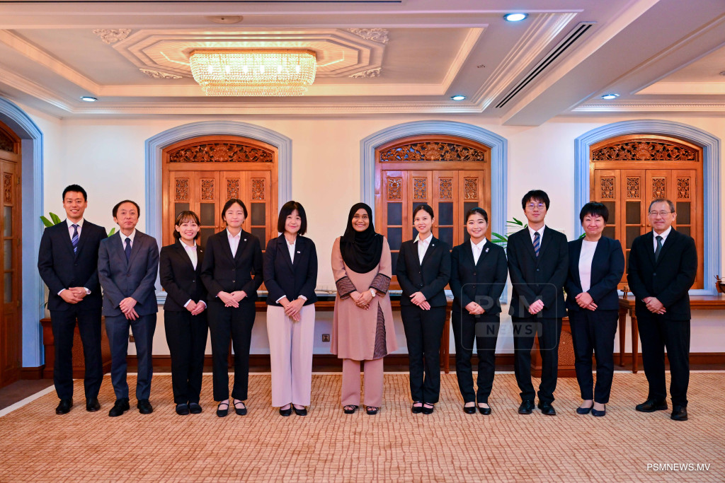 First Lady Sajidha Mohamed Tuesday hosted a delegation of volunteers from the Japan Overseas Cooperation Volunteers (JOCV) programme at the Official Residence of the President, Mulee’aage, expressing profound gratitude for their enduring commitment to various Maldivian islands.