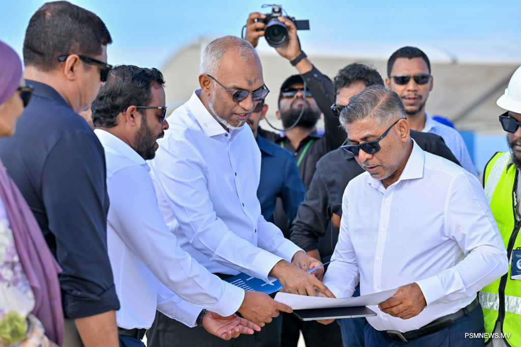 On arrival at the site, the President was received by the Minister of Construction, Housing and Infrastructure, Dr Abdulla Muththalib, alongside cabinet ministers, members of parliament, and senior officials from the Maldives Airports Company Limited (MACL), including its Managing Director and Chief Executive Officer, Ibrahim Shareef Mohamed.