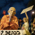 The demonstration was held under the slogan "Pardon = Banana Republic," with participants standing behind a large pile of bananas topped with a sign labelled "Pardon" in a satirical reference to the clemency request.