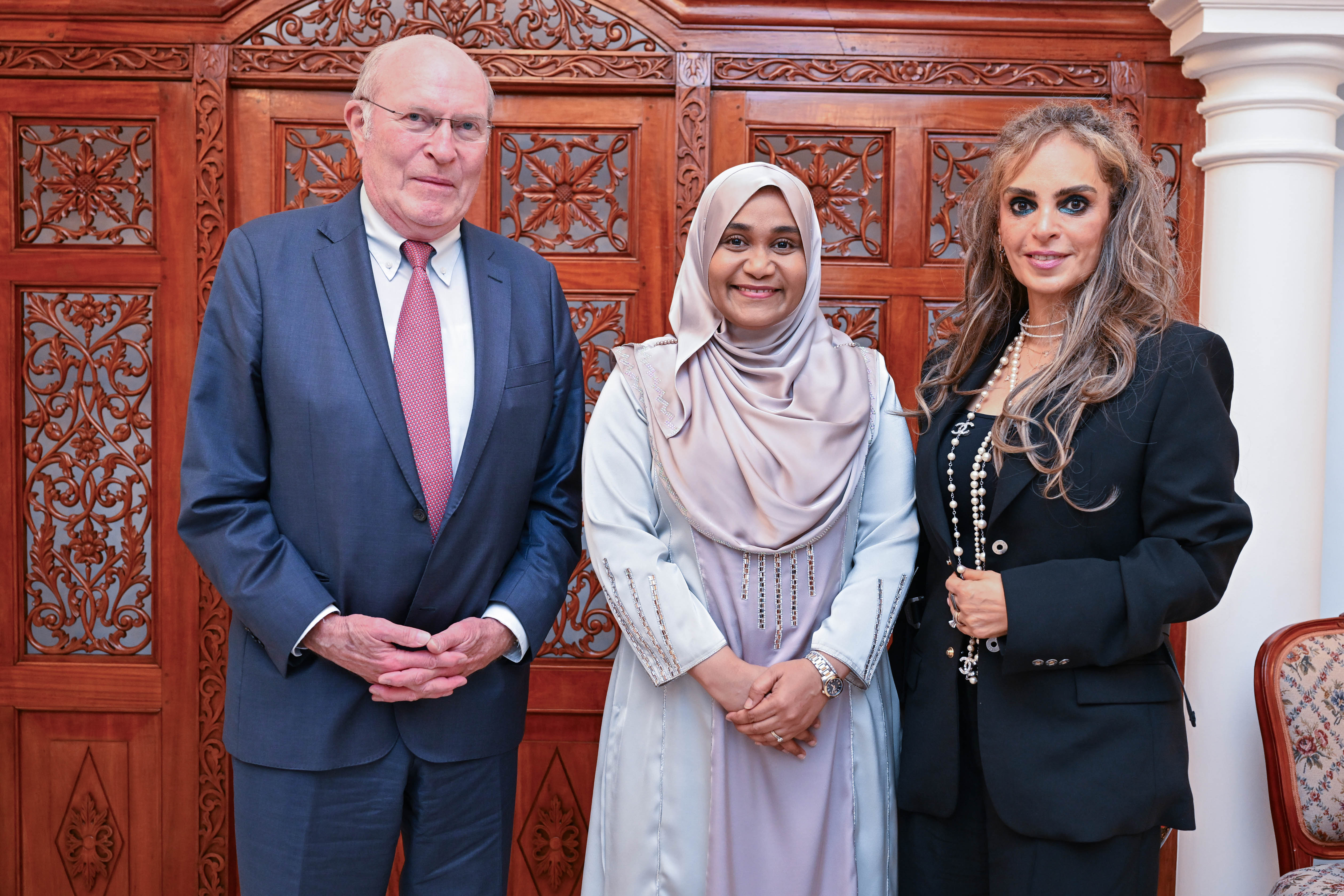 Professor Dr Frank Stangenberg-Haverkamp, Chairman of the Merck Foundation Board of Trustees and Former Chairman of the Executive Board of E. Merck KG, along with Senator, Dr Rasha Kelej, CEO of the Merck Foundation met with First Lady Madam Sajidha Mohamed. The meeting was held this evening at the Official Residence of the President, Muleeaage.