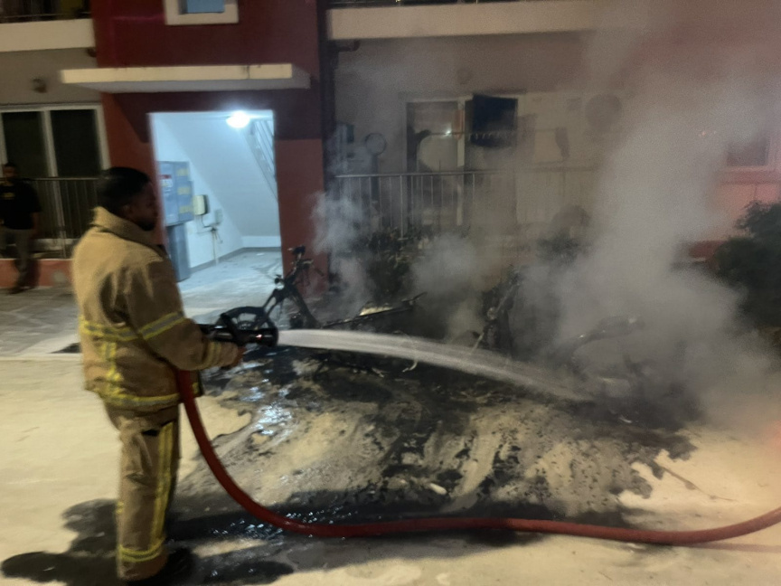 MNDF detailed that firefighters from the Hithadhoo Fire Station responded to the report and managed to bring the fire under control by around 4:25am. Two motorcycles completely burned down beyond use in the fire.