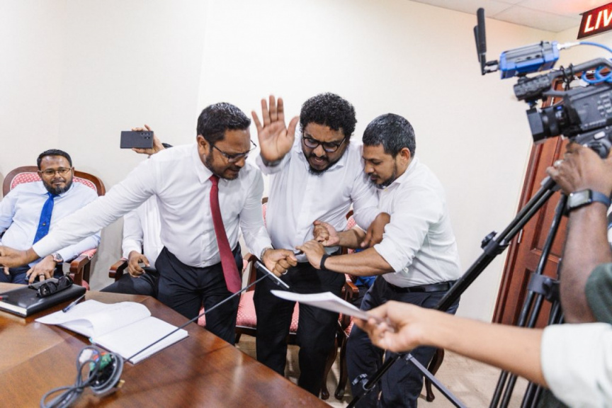 As Kendhoo MP Mauroof Zakir - from MDP - used a microphone at the committee room to voice his objections to the bill, South Henveiru MP Hussain Imran Latheef– from the PNC - snatched it from the hands of Mauroof and Thoddoo MP Hussain Sameer - another lawmaker from the MDP - and dropped it to the ground.