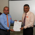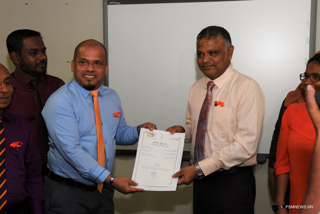 At a function held at ECM, President of ECM Ahmed Shareef handed over the certificate of registration to executive member of MRM, Minister of Higher Education Dr. Ibrahim Hassan.
