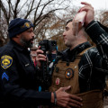 Pandemonium ensues as a protester pushes the book out of Lang's hands, sparking a melee as another individual grabs the book before it is slapped out of his hands. It is then picked up by an individual who runs it out of the area.