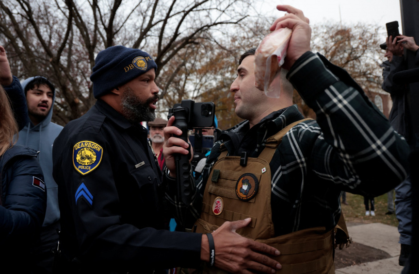 Jake Lang attempts to burn a Quran in Dearborn, a man takes the Quran before he could do so pic.twitter.com/18YKgYAHsM