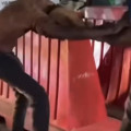 The video shows a man wearing only jeans being dragged across the ground, pinned down by a booted assailant, and eventually thrown into the sea from a jetty. Bystanders can be seen watching without intervening. The video includes a silent exchange between the man and another individual, with the uploader claiming the man was accused of stealing.
