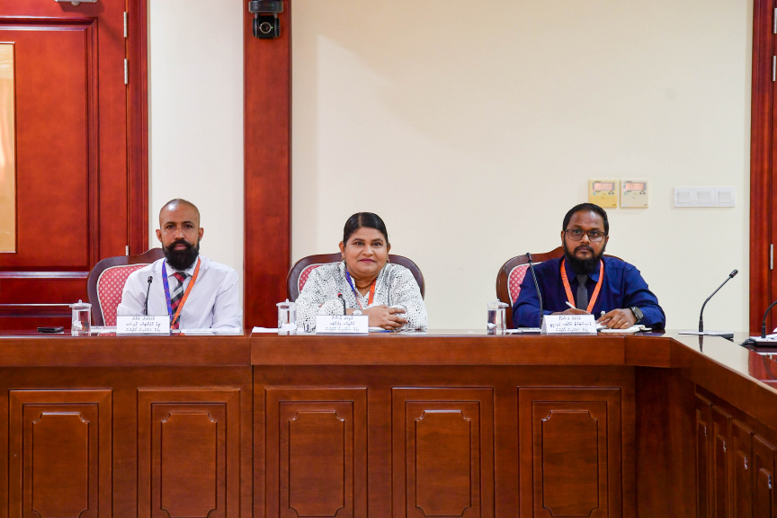 FSM’s Managing Director Fathimath Ashan (c) responds to questions at Parliament's Public Accounts Committee on November 5, 2025. (Photo/People's Majlis)