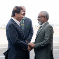 Sardar Ayaz Sadiq was received at Velana International Airport by Speaker Abdul Raheem Abdulla, marking the latest high-level parliamentary exchange between the two countries.