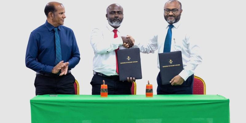 The signing ceremony took place at the Diddhoo Council Office, where Council President Abdulla Rasheed represented the Council, while Minister of Islamic Affairs Dr. Mohamed Shaheem Ali Saeed signed on behalf of the Ministry.