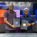 Officials of Sun Siyam Media and VAM: SS Media signed an agreement to become the official media partner for four upcoming tournaments organized by VAM, October 23, 2025. (Sun Photo/Ahmed Firyal)