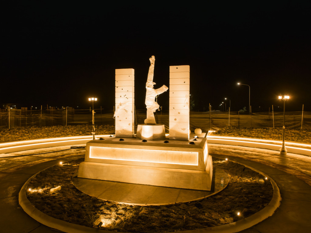 The memorial’s main feature is a seven-foot-high replica of the AK-47 rifle used by Hussain Adam during the attack. Pillars flanking the gate will mirror the bullet-hole patterns found at the scene where he was martyred. The landscaping includes green and red trees, with the monument’s floor painted white as part of the symbolic design.